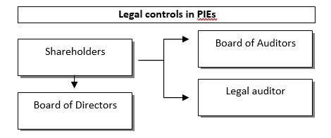 The main feature of the auditing of PIE is that the Board of Auditors (Collegio Sindacale) cannot carry out legal auditing of accounts, but it can exercise its supervisory role only on the company management (Article 16, subparagraph 2, of Legislative Decree no. 39 of 2010). The legal auditing, instead, must be necessarily carried out by an external legal auditor (an independent auditor, revisore or a legal auditing company, società di revisione), that has to fulfil a series of independence requirements. This means that in PIEs the Control Body must be composed of two organs, the Board of Auditors and an independent auditor or an external auditing company, as shown in the table below: